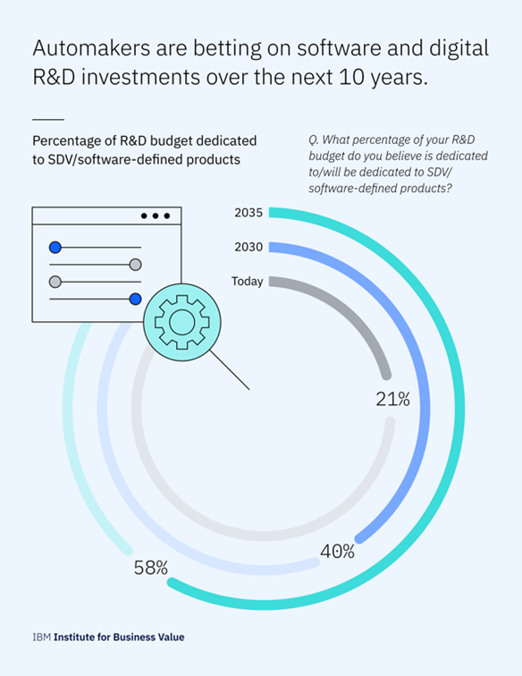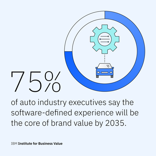 In a recently published study “Automotive 2035”, The IBM Institute for Business Value (IBV) predicts that by 2035, 82% of new cars will be electric to some degree, including pure electric vehicles (EVs), hybrids, and fuel cell vehicles. Additionally, 75% of industry executives believe the software-defined experience will be the core brand value. This shift will require significant changes, for example, in electrical and electronics (E/E) architectures, product development processes and methodologies, and service operations, as it requires continuous updates throughout a vehicle’s lifecycle.